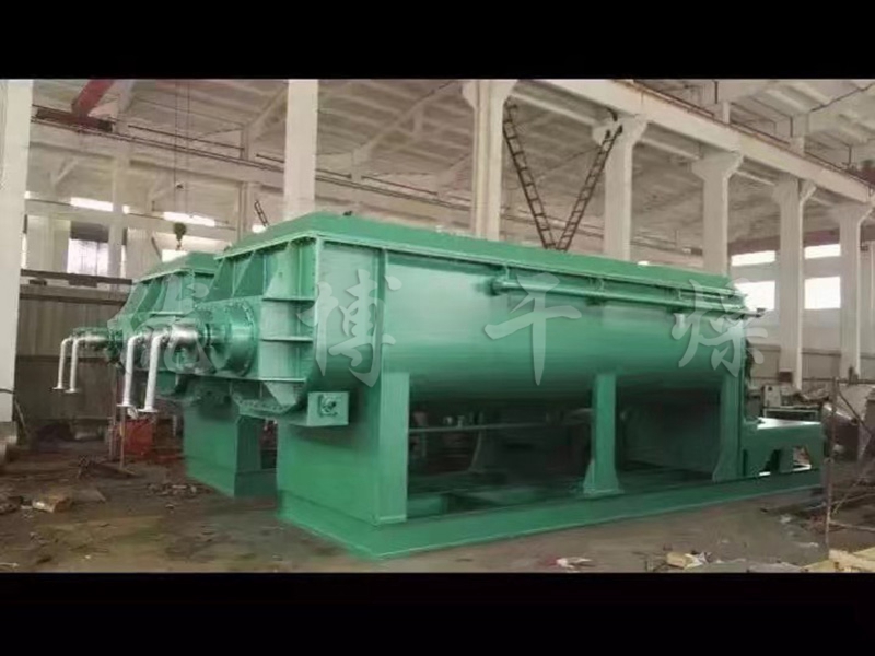 空心轴上密集排列着楔型中空桨叶,热介质经空心轴流经桨叶。单位有效容积内传热面积很大,热介质温度从-40℃到320℃,可以是水蒸汽,也可以是液体型:如热水、导热油等。间接传导加热,没有携带空气带走热量,热量均用来加热物料。热量损失仅为通过器体保温层向环境的散热。楔型 桨叶传热面具有自清洁功能。物料颗粒与楔型面的相对运动产生洗刷作用,能够洗刷掉楔型面上附着物料,使运转中一直保持着清洁的传热面。桨叶干燥机的壳体为W型,壳体内一般安排二到四根空心搅拌轴。壳体有密封端盖与上盖,防止物料粉尘外泄及收集物料溶剂蒸汽。出料口处设置一挡扳,保证料位高度,使传热面被物料覆盖而充分发挥作用。热介质通过旋转接头,流经壳体夹套及空心搅拌轴,空心搅拌轴依据热介质的类型而具有不同的内部结构,以保证^佳的传热效果。